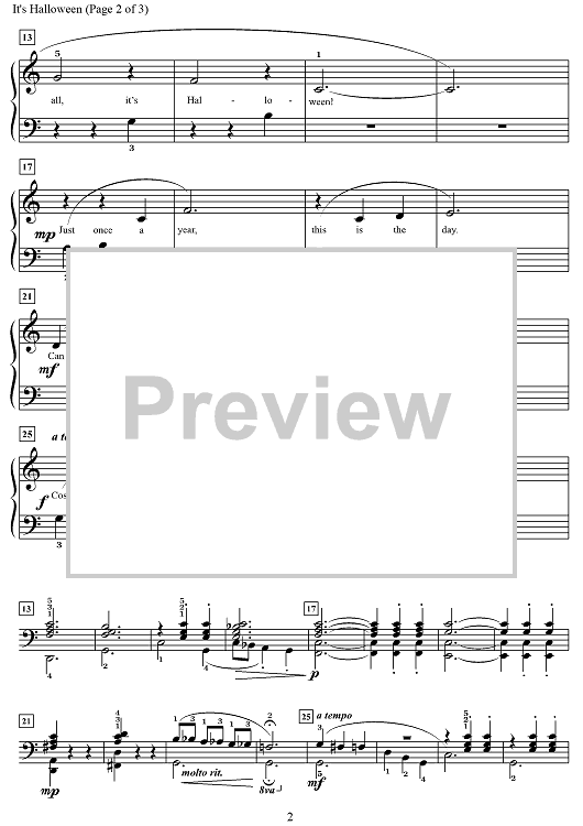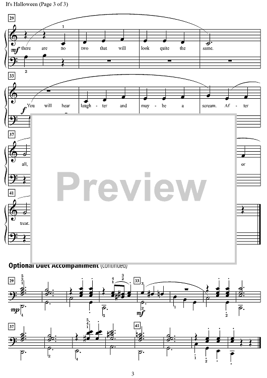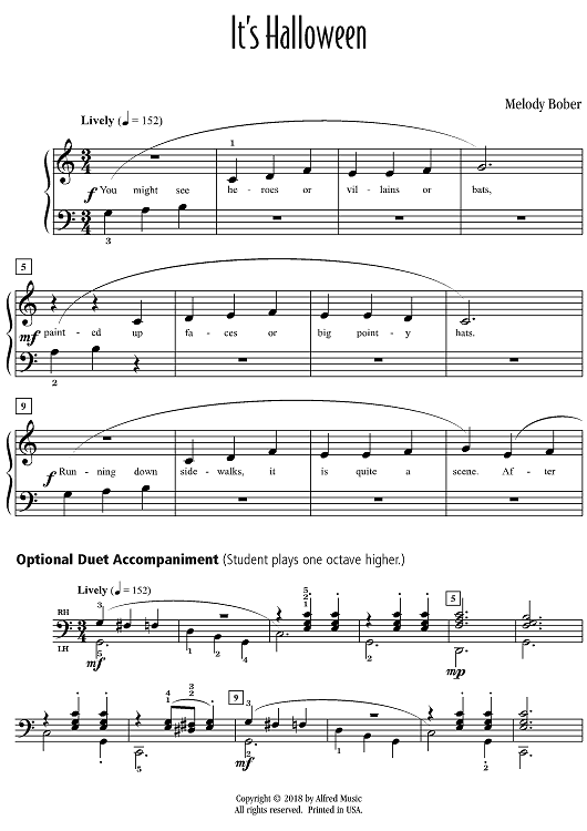 The words of this lively waltz describe various scenes when children trick or treat on Halloween. Long lyrical lines with simple rhythms and changing dynamics encourage musical playing in early elementary pianists. The optional duet accompaniment adds harmonic interest and rhythmic energy.