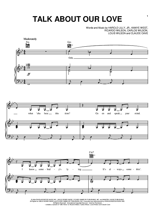 Digital Sheet Music for Talk About Our Love by Brandy, Harold Lilly Jr, Kanye West, Ricardo Wilson scored for Piano/Vocal/Chords; id:374969