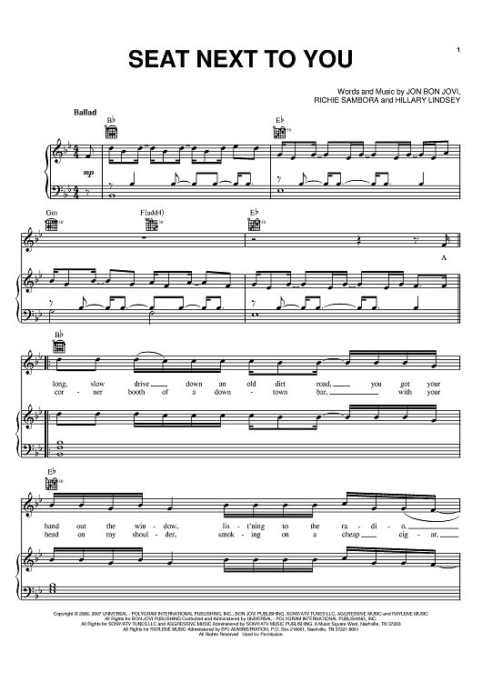Digital Sheet Music for Seat Next To You by Bon Jovi, Richie Sambora, Jon Bon Jovi, Hillary Lindsey scored for Piano/Vocal/Chords; id:401751