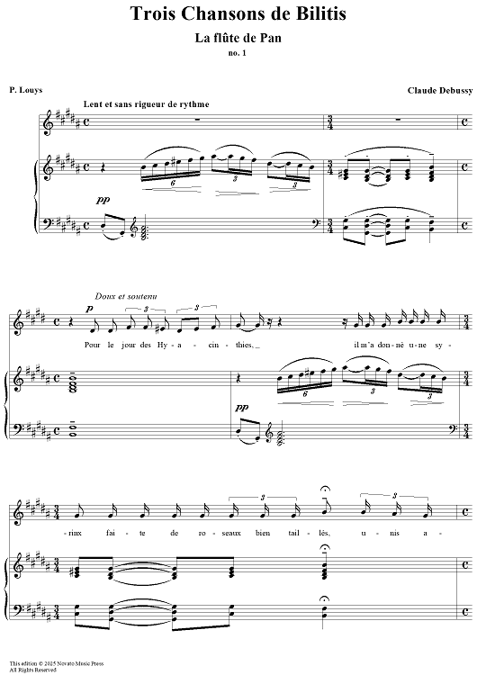 Claude Debussy's "Trois Chansons de Bilitis" is a set of three songs for female voice and piano, composed in 1897, with texts by Pierre Louÿs.