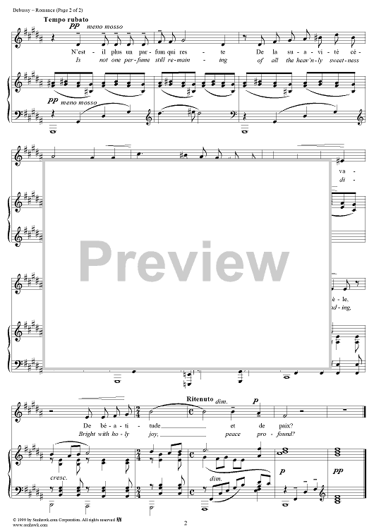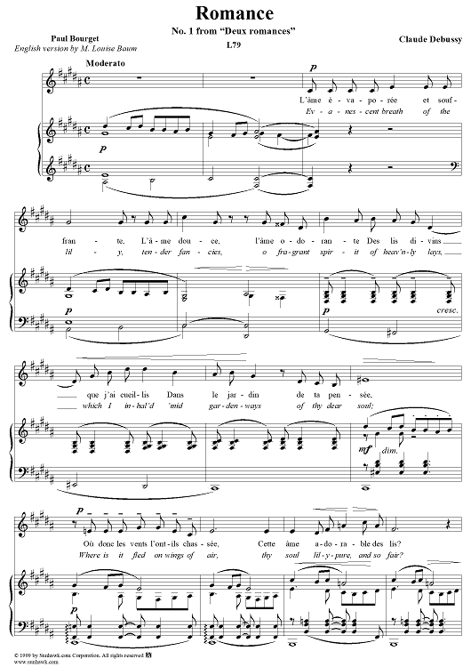 Digital Sheet Music for No. 1: Romance by Paul Bourget, Claude Debussy scored for Voice/Piano; id:240967