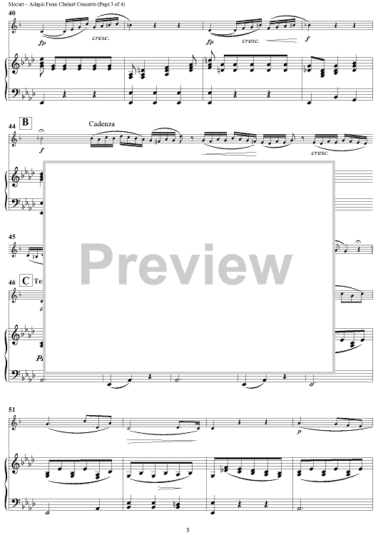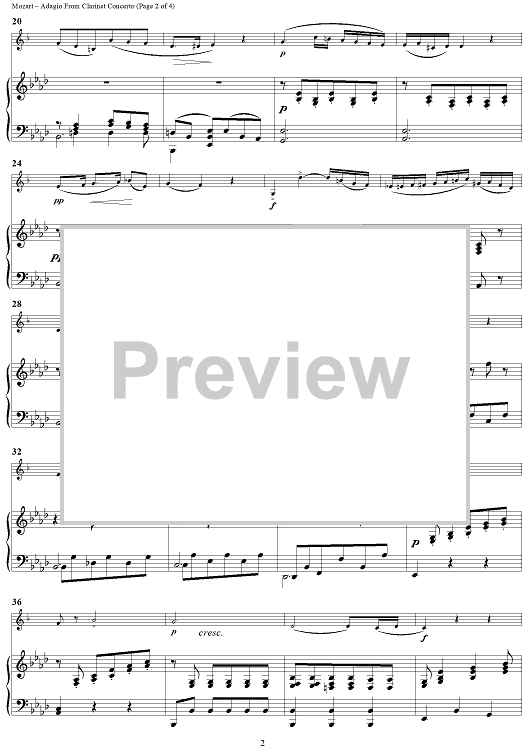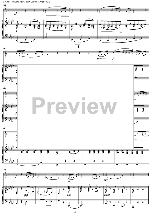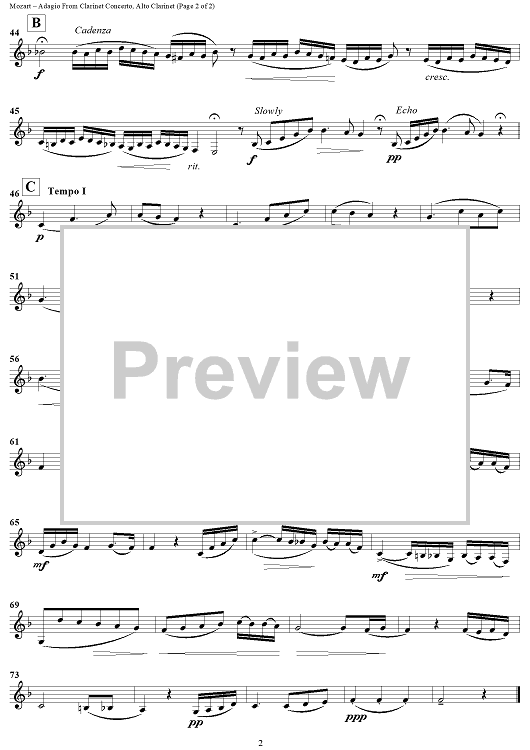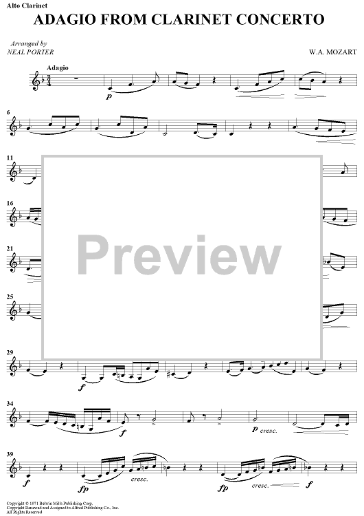 Digital Sheet Music for Adagio From Clarinet Concerto by Wolfgang Amadeus Mozart, Neal Porter scored for Eb Alto Clarinet/Piano; id:439422