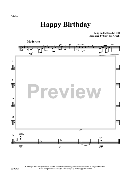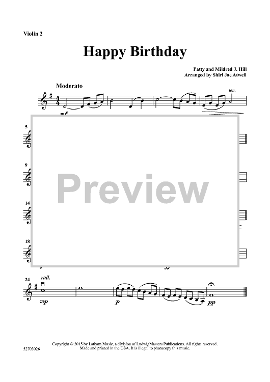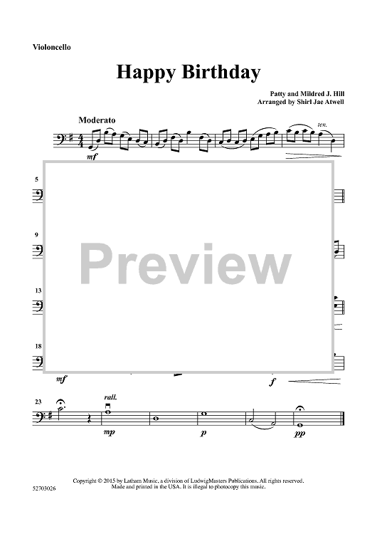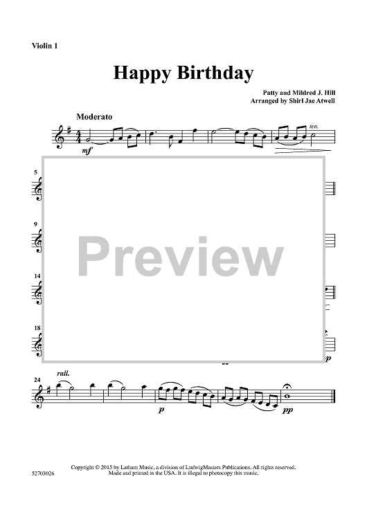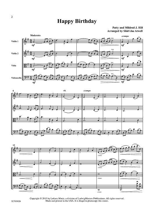 Digital Sheet Music for Happy Birthday by Mildred J. Hill, Patty S. Hill, Shirl Jae Atwell scored for String Quartet; id:461937