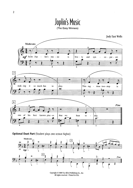 Scott Joplin's The Easy Winners is the basis for this piece and brings the joy of ragtime to an easier level. This famous melody is divided between the hands. Careful counting is needed to achieve the syncopation of the rhythm that is a hallmark of this style. The 8-bar introduction sets up the main section of the piece with fun lyrics that aid in learning the rhythm.