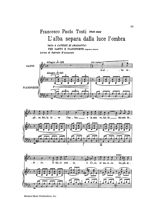 Digital Sheet Music for L'alba separa dalla luce l'ombra by Gabriele d'Annunzio, Francesco Paolo Tosti scored for Piano/Vocal; id:444598