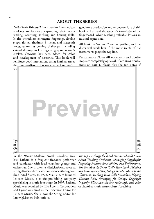 The second volume in this series includes intermediate level duets compatible for violin, viola, cello and bass. Learn dotted rhythms and 6/8 meter, chromatic fingerings, facility with pizzicato, varying types of bow strokes, and double stops as students are introduced to shifting with familiar classic tunes. This volume is a technique builder and works best with the more treble of the two instruments on the top line.