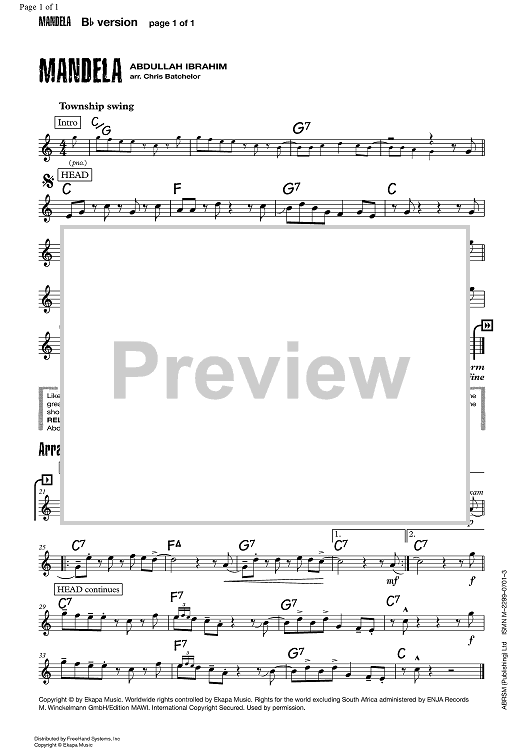 Digital Sheet Music for Mandela by , Chris Batchelor, Abdullah Ibrahim scored for B-flat Lead Sheet; id:355619