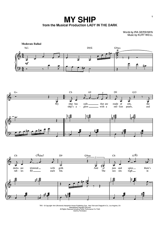 Digital Sheet Music for My Ship by Ira Gershwin, Miles Davis, Sarah Vaughan, Johnny Hartman, Gertrude Lawrence, Kurt Weill scored for Piano/Vocal/Chords; id:380445