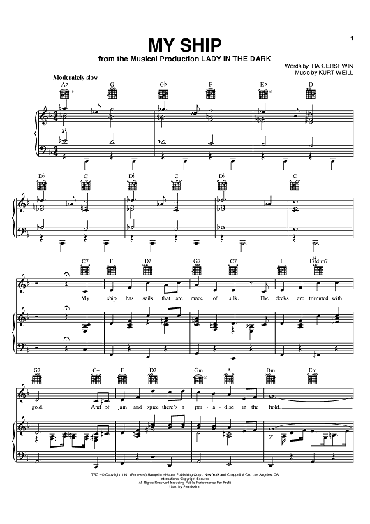 Digital Sheet Music for My Ship by Ira Gershwin, Miles Davis, Sarah Vaughan, Johnny Hartman, Gertrude Lawrence, Kurt Weill scored for Piano/Vocal/Chords; id:390912