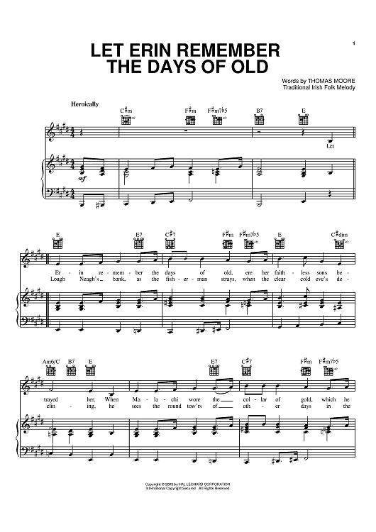 Digital Sheet Music for Let Erin Remember The Days Of Old by Thomas Moore scored for Piano/Vocal/Chords; id:373086