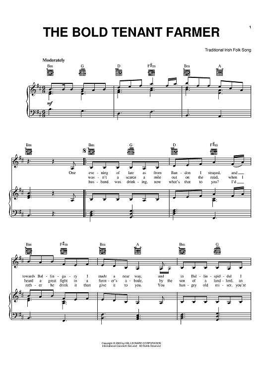 Digital Sheet Music for The Bold Tenant Farmer by scored for Piano/Vocal/Chords; id:373103