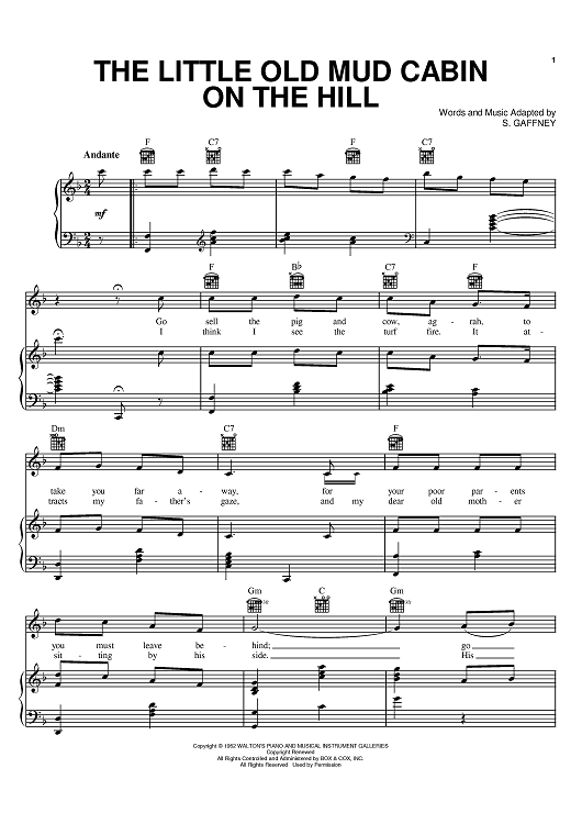 Digital Sheet Music for The Little Old Mud Cabin On The Hill by S. Gaffney scored for Piano/Vocal/Chords; id:393719