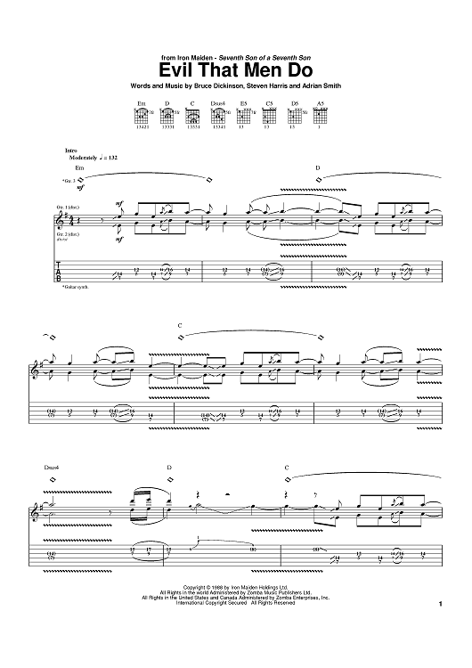 Digital Sheet Music for Evil That Men Do by Steve Harris, Bruce Dickinson, Adrian Smith, Iron Maiden scored for Guitar Tab; id:391015