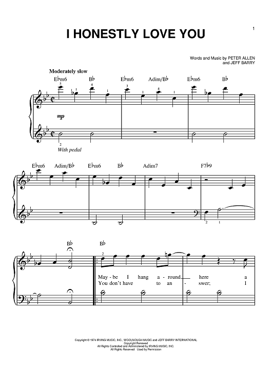 Digital Sheet Music for I Honestly Love You by Olivia Newton-John, Jeff Barry, Peter Allen scored for Easy Piano; id:367417