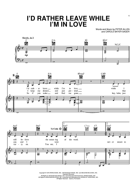 Digital Sheet Music for I'd Rather Leave While I'm In Love by Carole Bayer Sager, Peter Allen scored for Piano/Vocal/Chords; id:373345