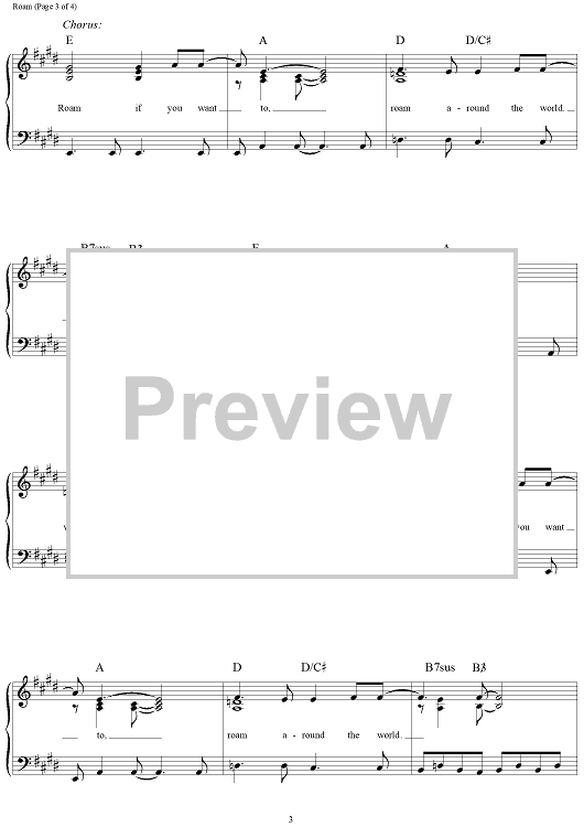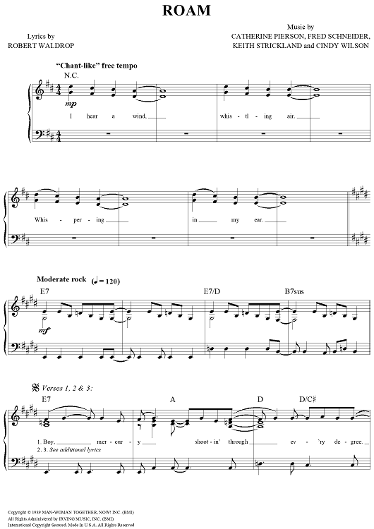 Digital Sheet Music for Roam by Keith Strickland, Cindy Wilson, Catherine Pierson, Fred Schneider, Robert Waldrop, The B-52's scored for Piano/Vocal/Chords; id:254655