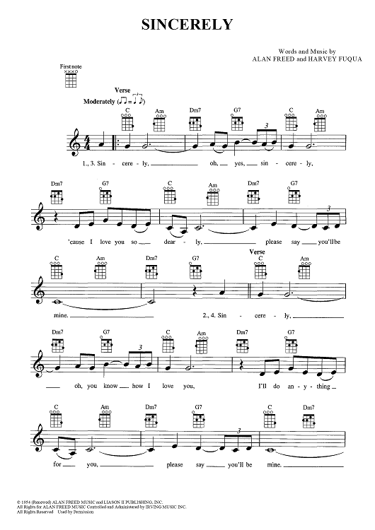 Digital Sheet Music for Sincerely by Harvey Fuqua, The Moonglows, Alan Freed scored for Ukulele/Vocal; id:447376