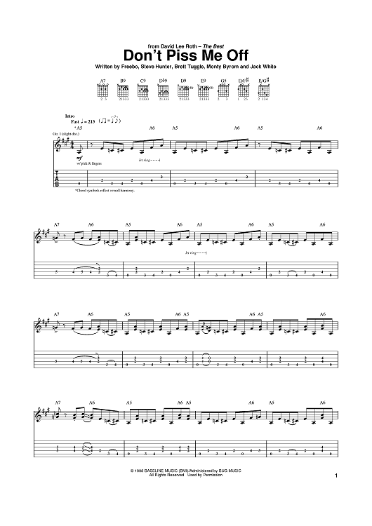 Digital Sheet Music for Don't Piss Me Off by David Lee Roth, Monty Byrom, Freebo, Steve Hunter, Brett Tuggle, Jack White scored for Guitar Tab; id:385935