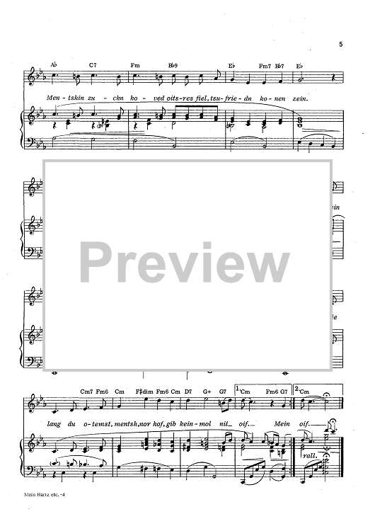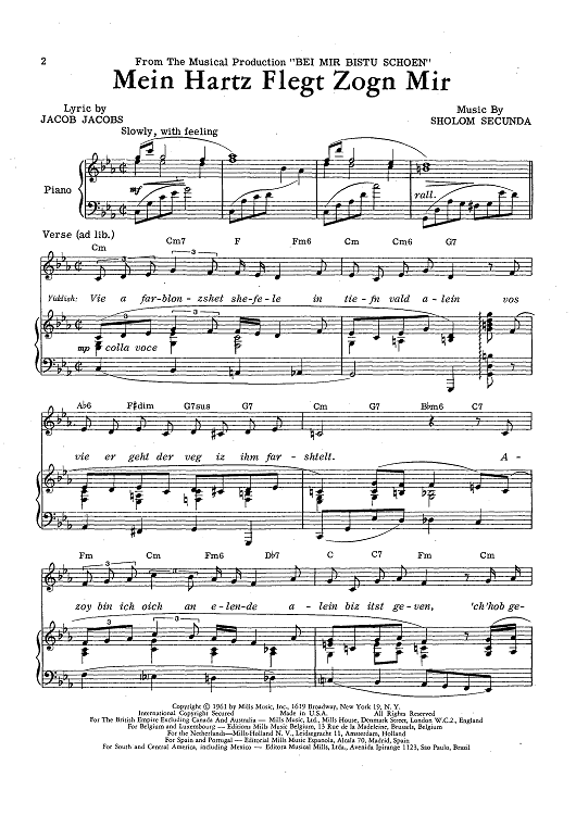 Digital Sheet Music for Mein Hartz Flegt Zogn Mir by Sholom Secunda, Jacob Jacobs scored for Piano/Vocal/Chords; id:424206