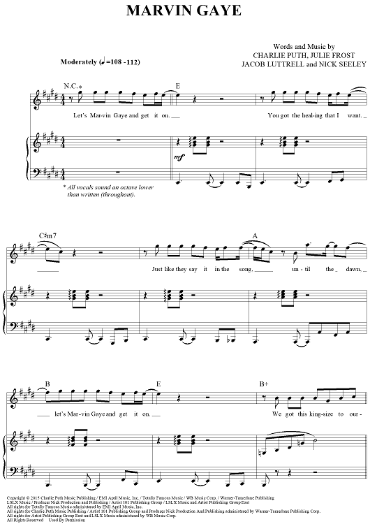 Digital Sheet Music for Marvin Gaye by Jacob Luttrell, Charlie Puth, Julie Frost, Nick Seeley scored for Piano/Vocal/Chords; id:449538