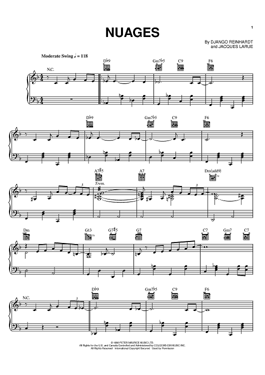 Digital Sheet Music for Nuages by Django Reinhardt, Stephane Grappelli, Jacques Larue scored for Piano/Vocal/Chords; id:373310