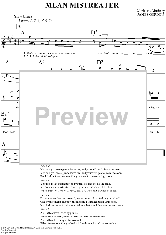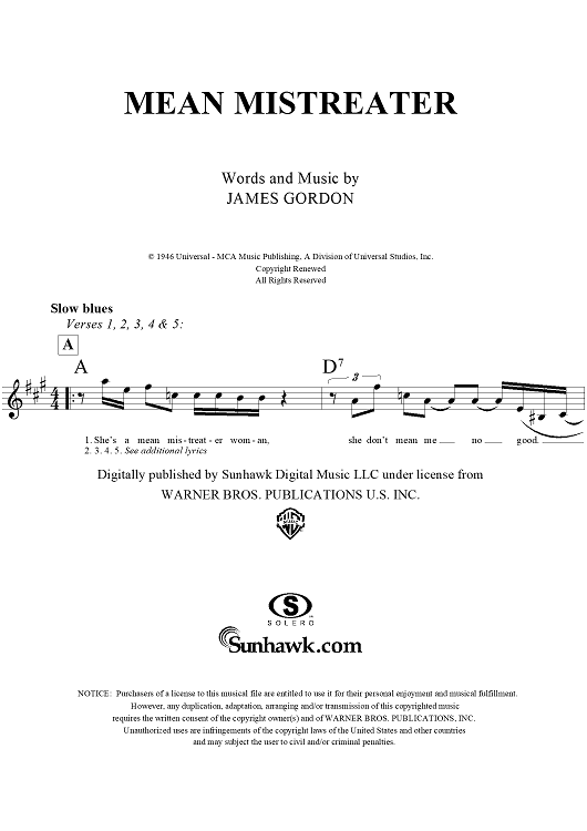 Digital Sheet Music for Mean Mistreater by James Gordon scored for Lead Sheet; id:291493