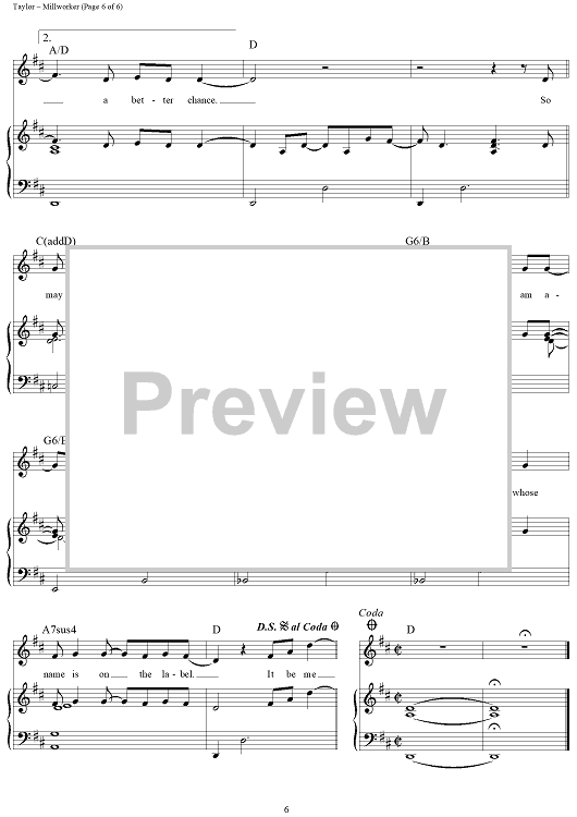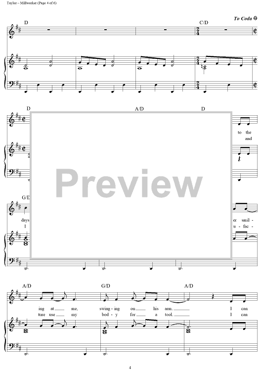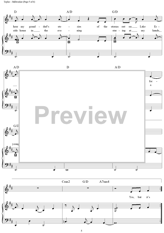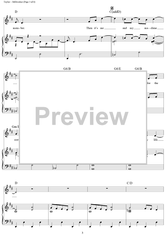 Digital Sheet Music for Millworker by James Taylor scored for Piano/Vocal/Chords; id:111289