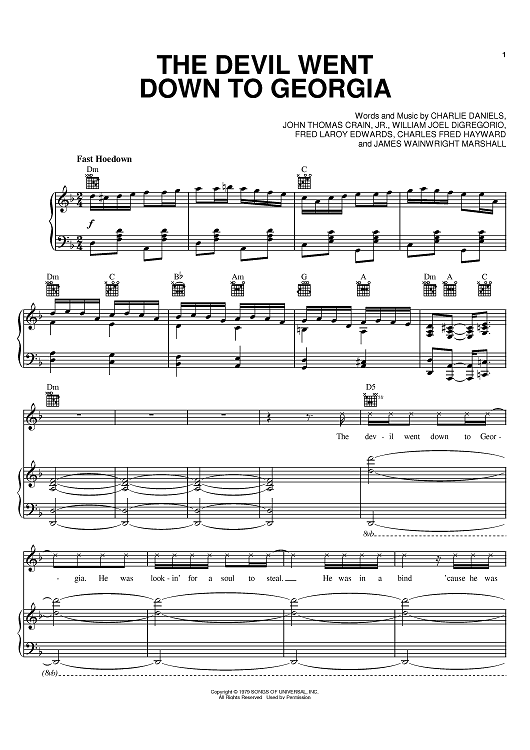 Digital Sheet Music for The Devil Went Down To Georgia by Charlie Daniels, Tommy Crain, Taz DiGregorio, Charlie Hayward, Charlie Daniels Band, Fred Laroy Edwards, James Wainwright Marshall scored for Piano/Vocal/Chords; id:380598