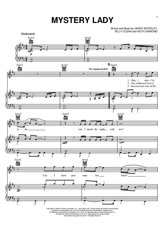 Digital Sheet Music for Mystery Lady by Billy Ocean, Keith Diamond, James Woodley scored for Piano/Vocal/Chords; id:388744