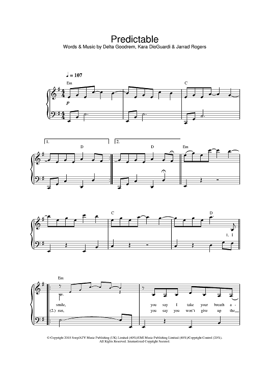Digital Sheet Music for Predictable by Kara DioGuardi, Delta Goodrem, Jarrad Rogers scored for Piano; id:378266