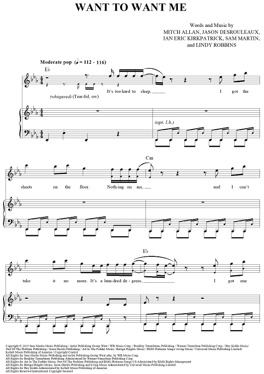 Digital Sheet Music for Want To Want Me by Lindy Robbins, Mitch Allan, Jason Derulo, Ian Kirkpatrick scored for Piano/Vocal/Chords; id:449541
