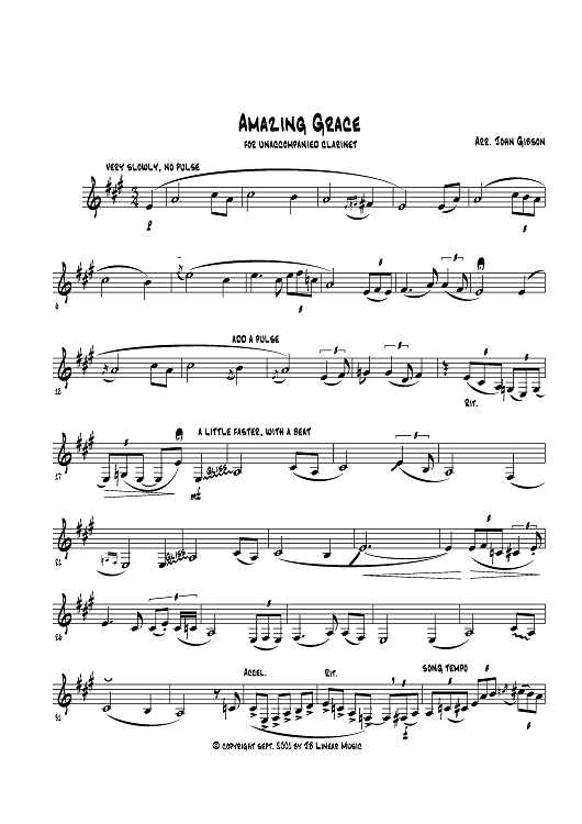 Digital Sheet Music for Amazing Grace by John Gibson, Traditional American Melody scored for Unaccompanied Clarinet; id:423855