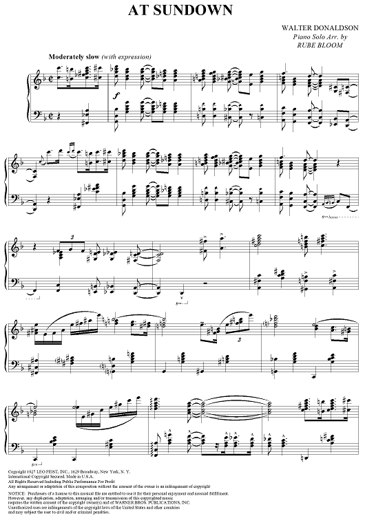 Digital Sheet Music for At Sundown by Walter Donaldson, Rube Bloom scored for Piano Solo; id:355064