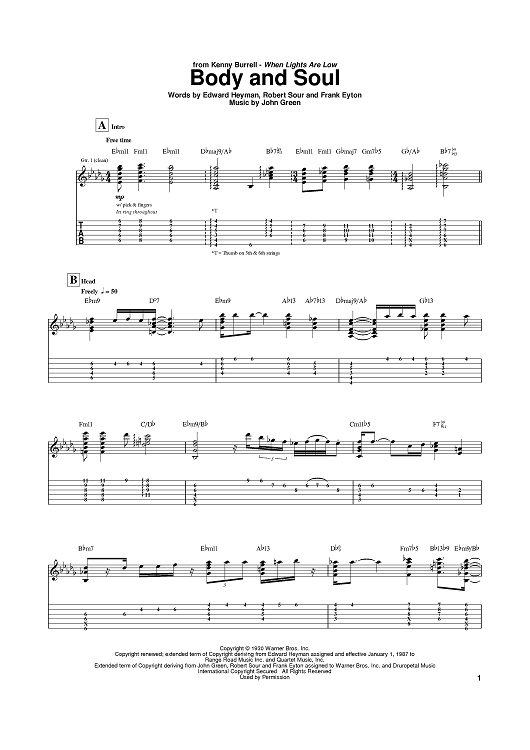 Digital Sheet Music for Body And Soul by Edward Heyman, Johnny Green, Frank Eyton, Robert Sour, Kenny Burrell scored for Guitar Tab; id:389799