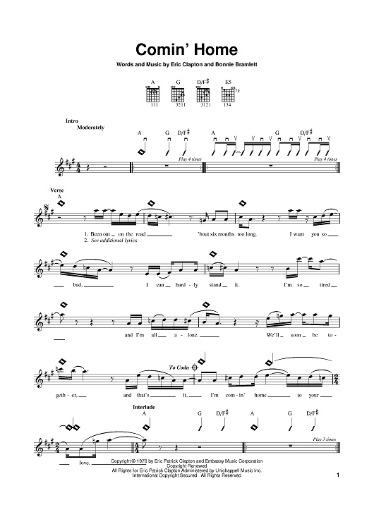 Digital Sheet Music for Comin' Home by Eric Clapton, Bonnie Bramlett scored for Lead Sheet with Guitar Grids; id:371723