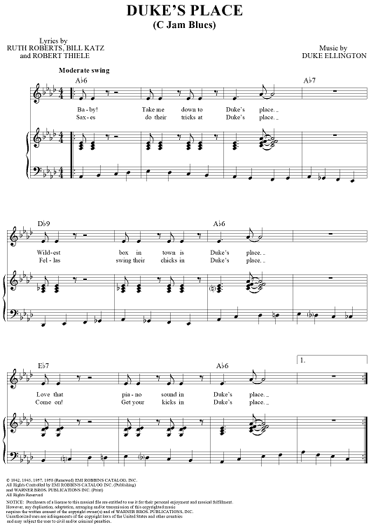 Digital Sheet Music for Duke's Place (C Jam Blues) by Duke Ellington, Bob Thiele, Ruth Roberts, Bill Katz scored for Piano/Vocal/Chords; id:132888