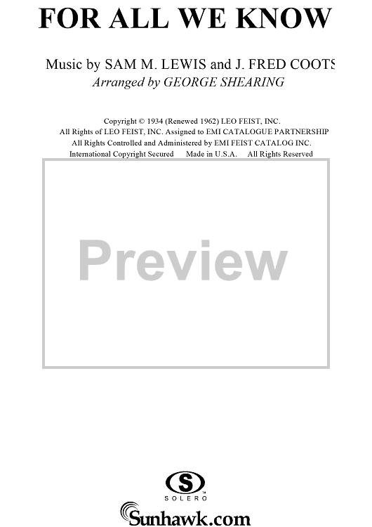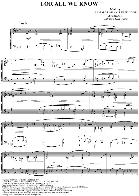 Digital Sheet Music for For All We Know by George Shearing, J. Fred Coots, Samuel M. Lewis scored for Piano Solo; id:112156