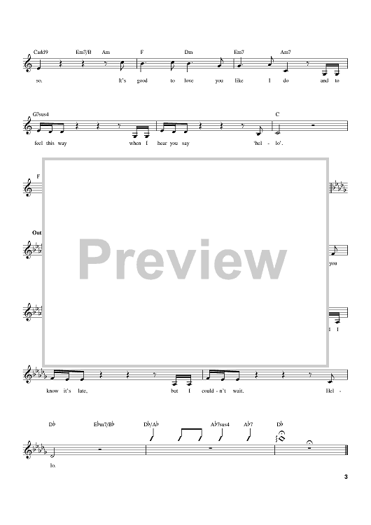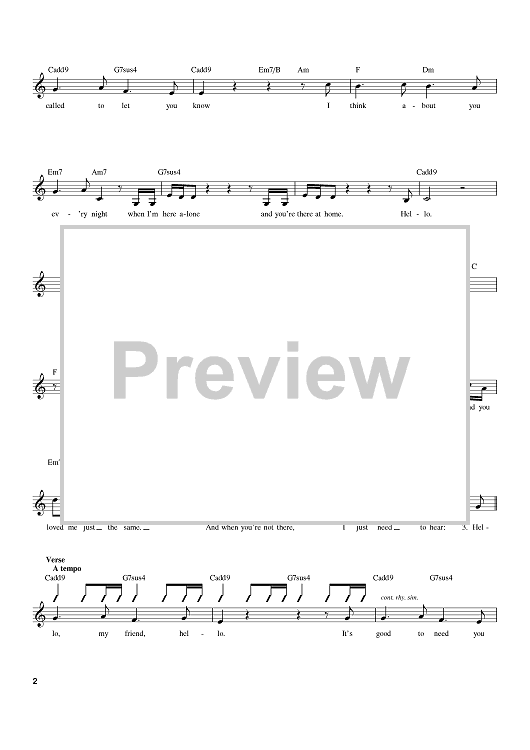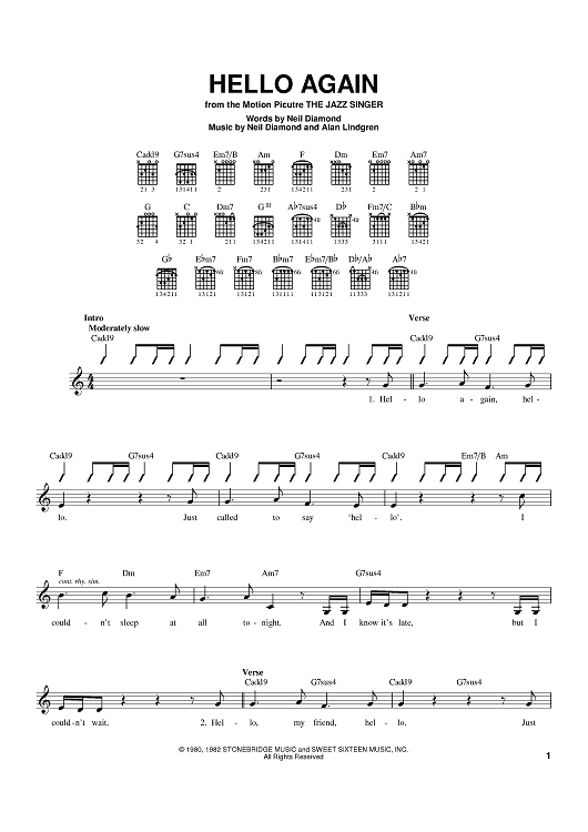 Digital Sheet Music for Hello Again by Neil Diamond, Alan Lindgren scored for Lead Sheet with Guitar Grids; id:382192