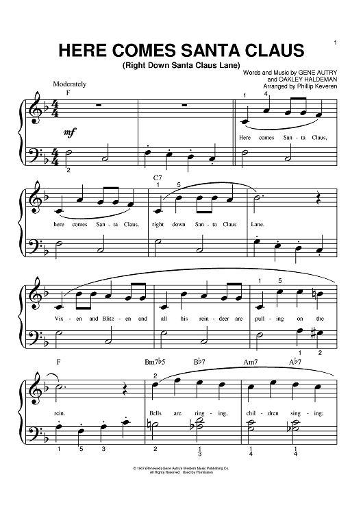 Digital Sheet Music for Here Comes Santa Claus (Right Down Santa Claus Lane) by Elvis Presley, The Carpenters, Gene Autry, Oakley Haldeman, Phillip Keveren scored for Big Note Piano; id:385652