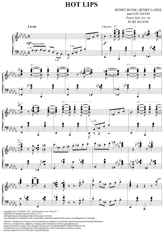 Digital Sheet Music for Hot Lips by Henry Busse, Henry Lange, Lou Davis, Rube Bloom scored for Piano Solo; id:355069