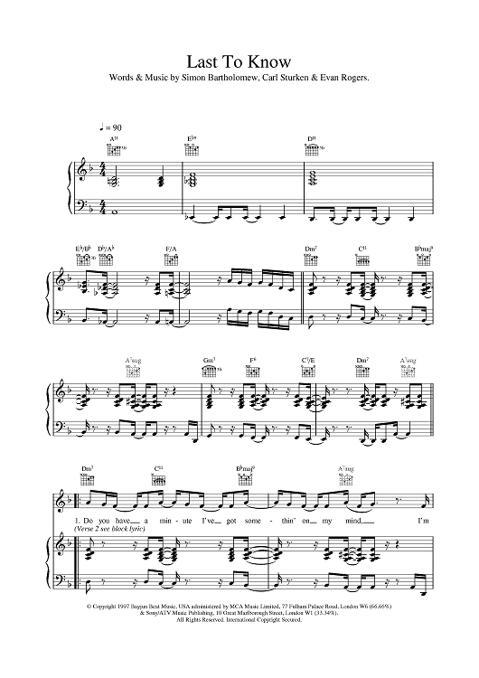 Digital Sheet Music for Last To Know by Brand New Heavies scored for Piano/Vocal/Chords; id:376499