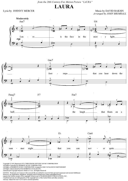 Digital Sheet Music for Laura by Johnny Mercer, Woody Herman, Stan Kenton, David Raksin, John Brimhall scored for Easy Piano/Vocal; id:120417