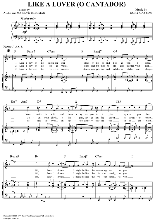 Digital Sheet Music for Like a Lover (O Cantador) by Alan Bergman, Marilyn Bergman, Sergio Mendes, Dory Caymmi scored for Piano/Vocal/Chords; id:273343