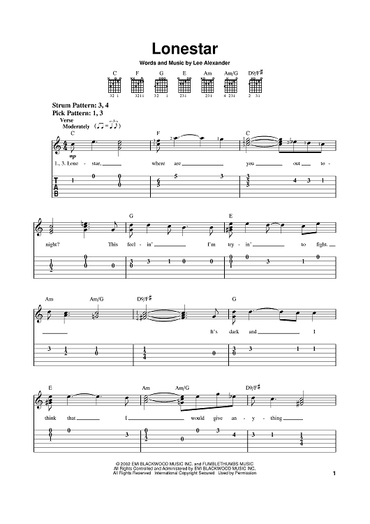 Digital Sheet Music for Lonestar by Norah Jones, Lee Alexander scored for Easy Guitar Tab; id:371401