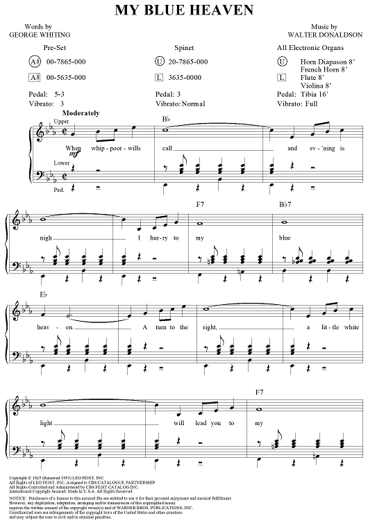 Digital Sheet Music for My Blue Heaven by Teddy Wilson, Walter Donaldson, George Whiting scored for Easy Organ/Vocal; id:120687