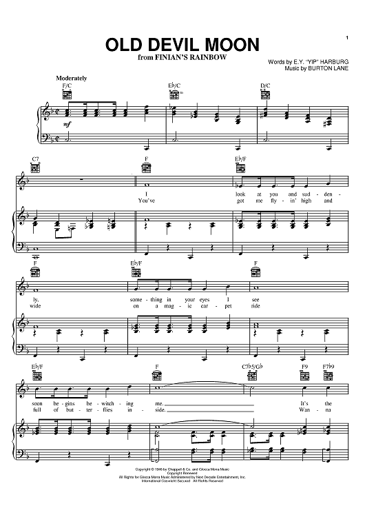 Digital Sheet Music for Old Devil Moon by Burton Lane, E.Y. "Yip" Harburg scored for Piano/Vocal/Chords; id:368493