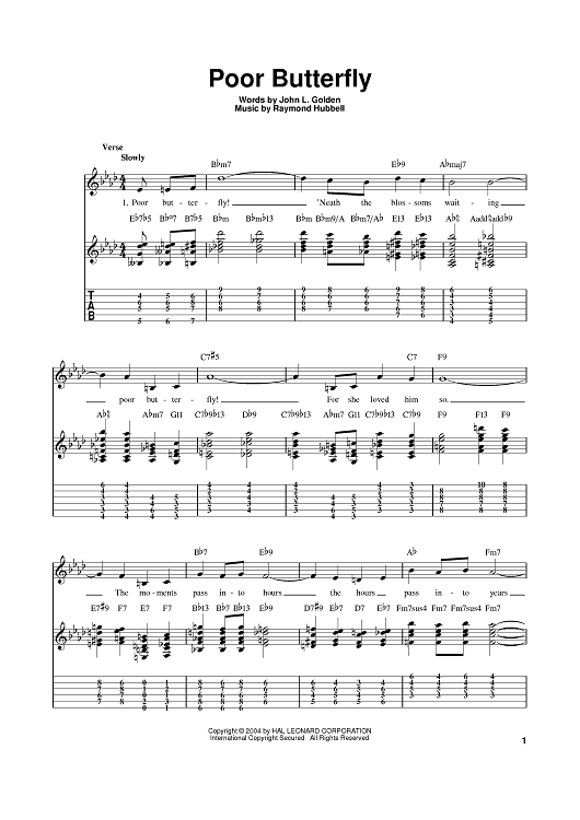 Digital Sheet Music for Poor Butterfly by Sarah Vaughan, Raymond Hubbell, John L. Golden, Benny Goodman, Charlie Christian scored for Easy Guitar Tab; id:375124