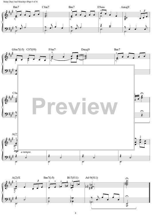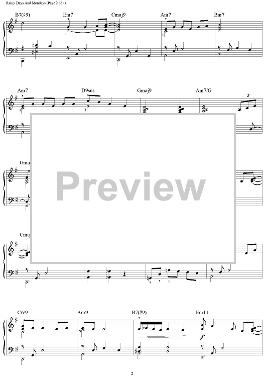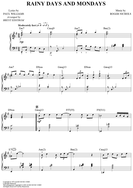 Digital Sheet Music for Rainy Days And Mondays by Roger Nichols, Paul Williams, Brent Edstrom scored for Piano Solo; id:462805