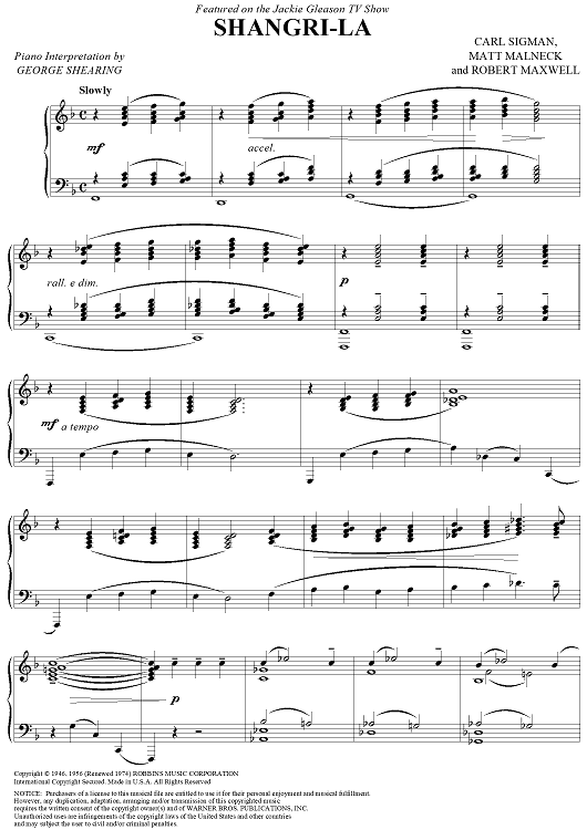 Digital Sheet Music for Shangri-La by Robert Maxwell, Carl Sigman, George Shearing, Matt Malneck scored for Piano Solo; id:314427