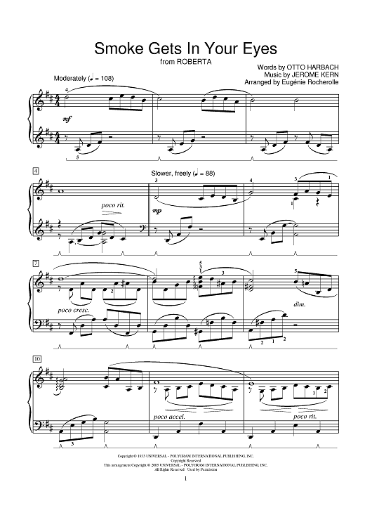 Digital Sheet Music for Smoke Gets In Your Eyes by Jerome Kern, Otto Harbach, Eugénie R. Rocherolle scored for Piano; id:381821